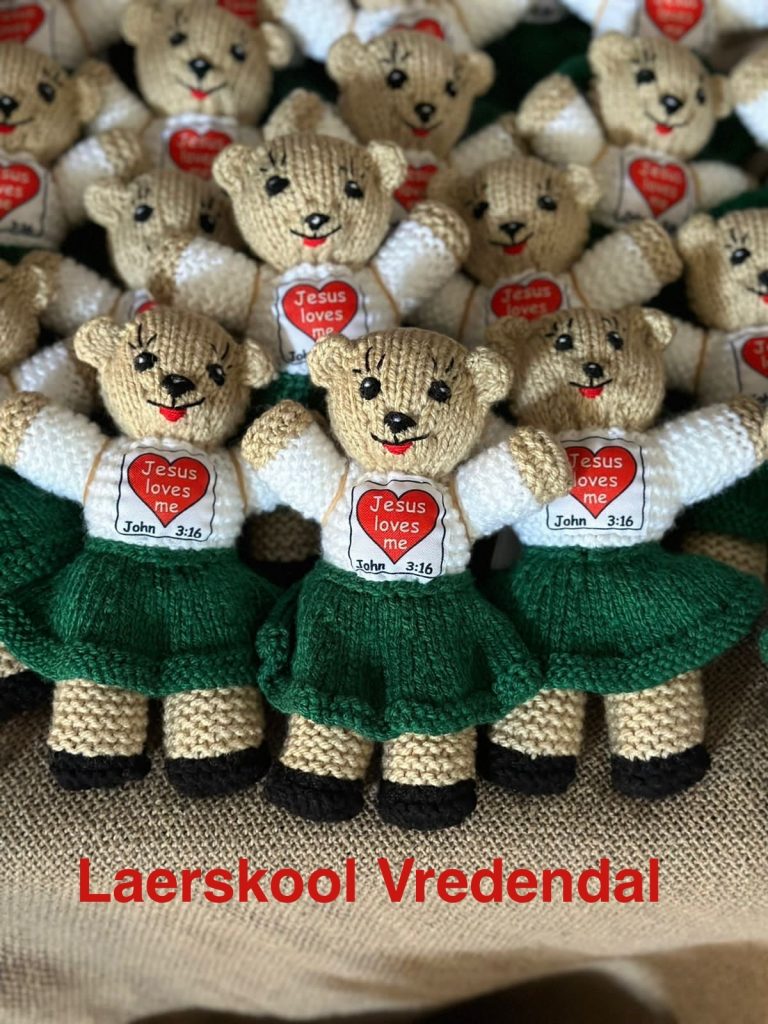 Indien u skool belangstel om vir julle graad 1’s Bidbeertjies te gee, stuur die klasjuffrou ‘n inligtingsstuk en video (wat ons voorsien) uit aan die ouers om die konsep te verduidelik. Sy maak ook ‘n opname van watter leerders se oumas en mammas graag self sal wil brei aan hierdie spesiale bidbeertjie. Indien daar kleintjies is wie se mammas of oumas nie kan brei nie, sal ons ‘n Teddietannie vra om vir hulle te brei. Die patroon word aan almal wat wil brei beskikbaar gestel.